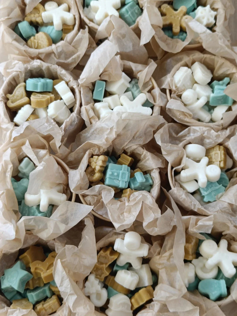 Τα χριστουγεννιάτικα Wax Melts δίνονται σε κραφτ συσκευασίες των 15τμχ του ίδιου αρώματος και τα χρώματα είναι τυχαία: λευκό, πράσινο, κόκκινο, μπεζ.